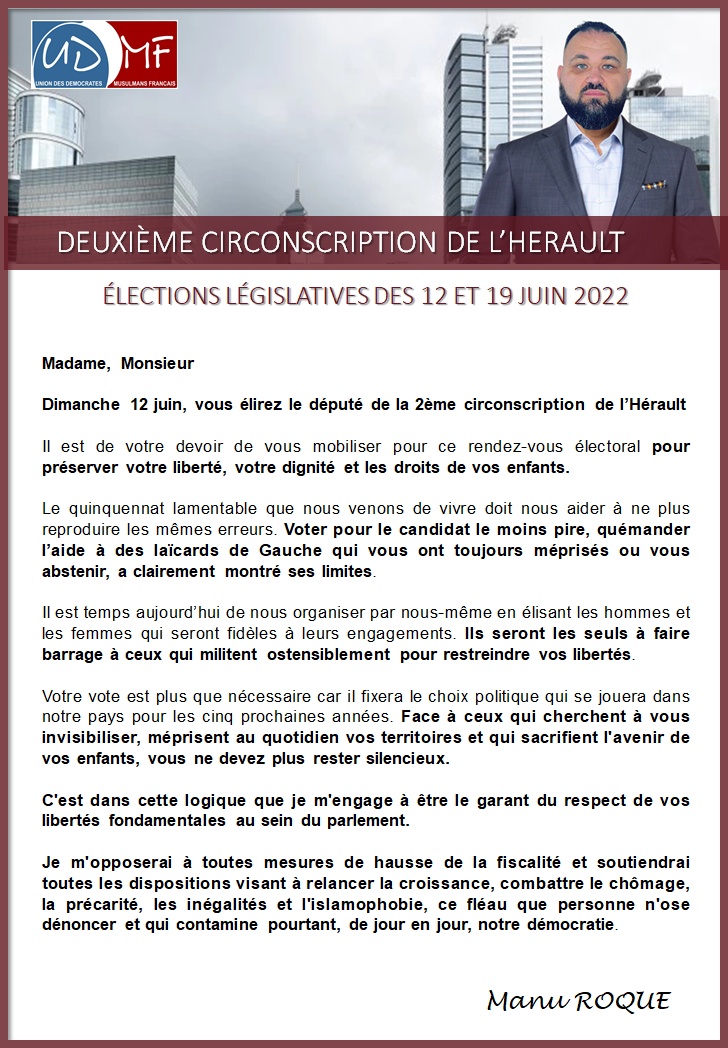 Je m'opposerai à toutes mesures de hausse de la fiscalité et soutiendrai toutes les dispositions visant à relancer la croissance, combattre le chômage, la précarité, les inégalités et l'islamophobie, ce fléau que personne n'ose dénoncer et qui contamine pourtant, de jour en jour, notre démocratie.